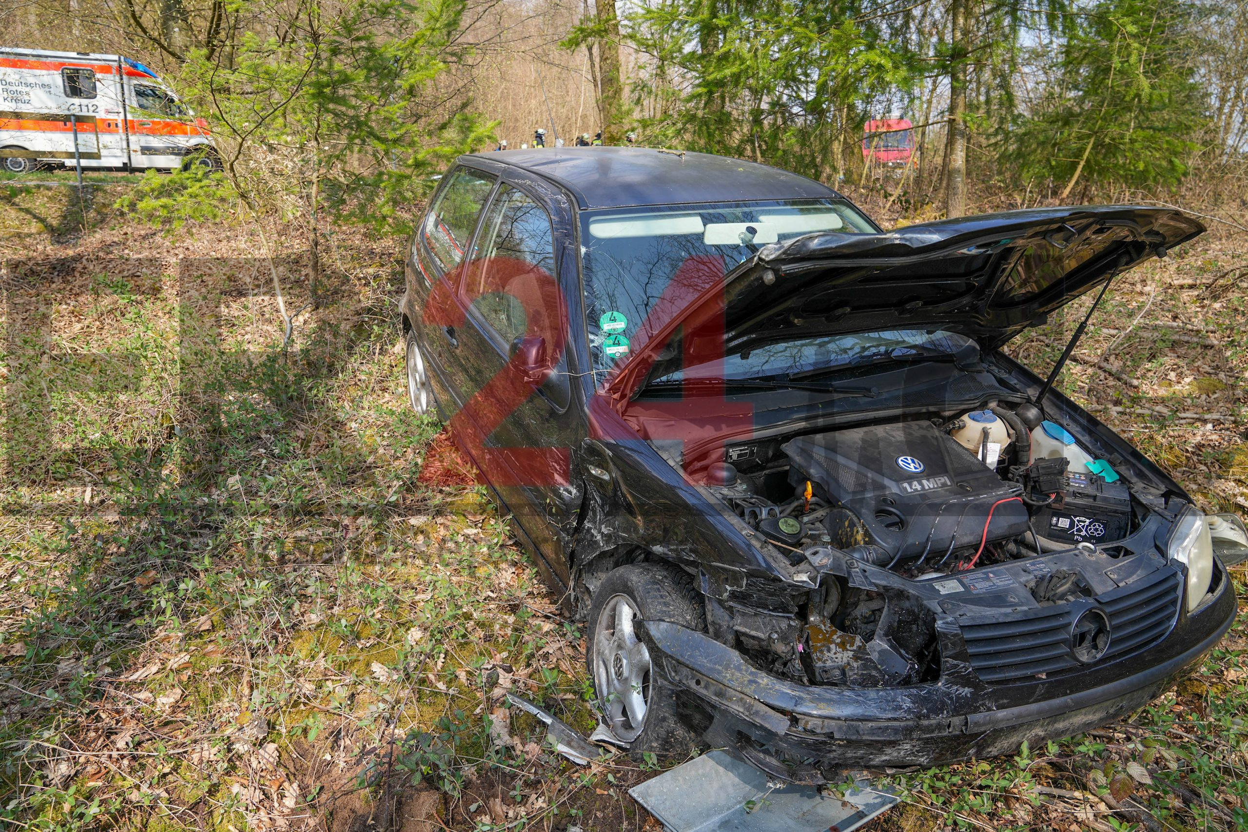 Ford und VW Polo kollidieren an Waldweg-Zufahrt – VW kommt von Straße ab und landet in Waldstück – Ford wird völlig demoliert in Böschung geschleudert – Schwerer Unfall endet glimpflich