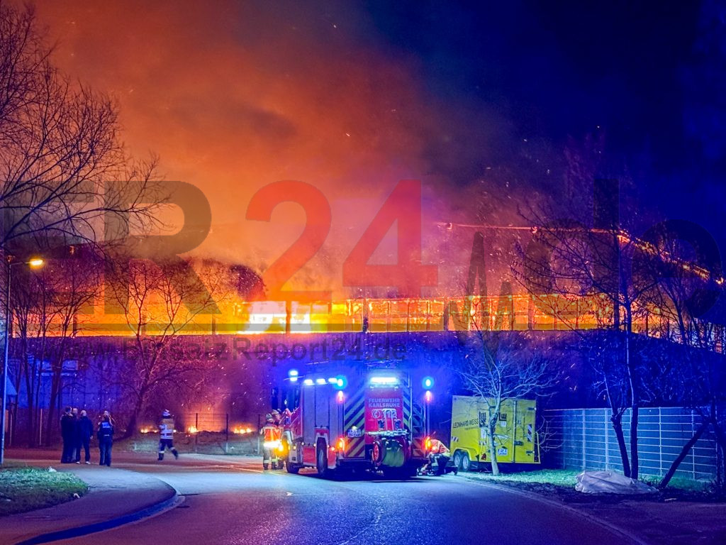Gegen kurz nach 21 Uhr wurden die Einsatzkräfte in das Industriegebiet „Im Schlehert“ im Karlsruher Rheinhafen alarmiert. Beim Eintreffen der ersten Kräfte stand eine rund 1.600 Quadratmeter (40 x 40 Meter) große Lagerhalle bereits in Vollbrand.