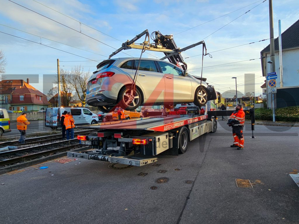 Wie die Polizei Karlsruhe mitteilte, kollidierte zwischen den Haltestellen Tivoli und Werderstraße, eine Straßenbahn mit einem querenden Mercedes.