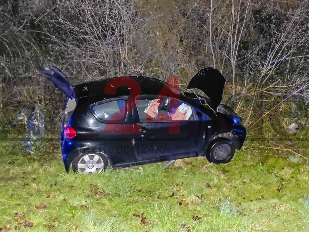 Auf Höhe des Umspannwerks verlor der Pkw-Fahrer offenbar die Kontrolle über sein Auto, überfuhr eine Verkehrsinsel und beschädigte dabei ein Verkehrszeichen. Daraufhin geriet er auf die Gegenfahrbahn und überfuhr einen Leitpfosten sowie ein weiteres Verkehrszeichen. Anschließend kam er offenbar links von der Fahrbahn ab und blieb im Straßengraben stehen. Der Fahrer erlitt nach derzeitigen Erkenntnissen keine Verletzungen.