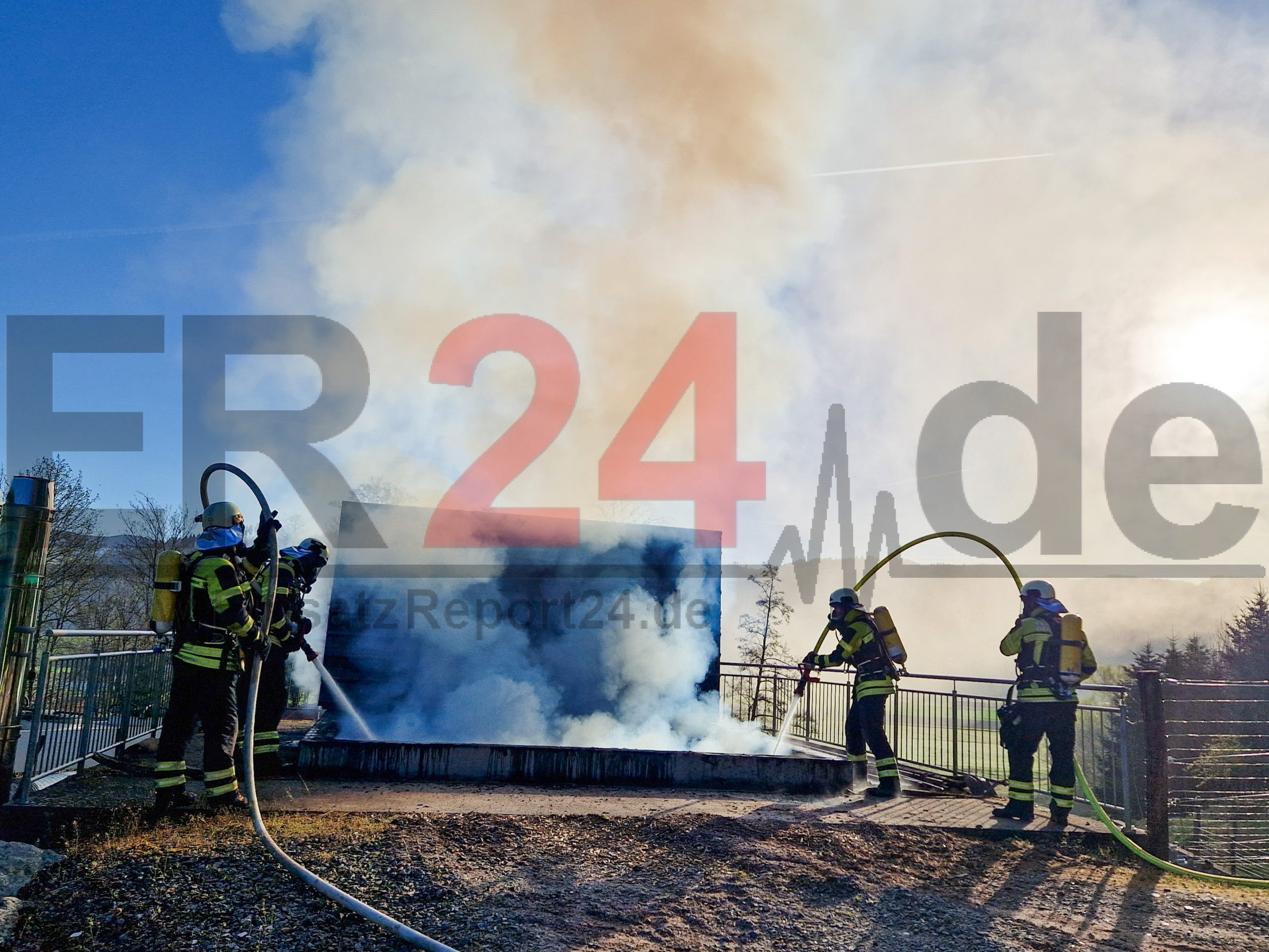 Feuer in Hackschnitzelbunker von Forstbetrieb sorgt für starke Rauchentwicklung – rund 200 Kubikmeter Hackschnitzel stehen in Flammen – Saugwagen soll bei Löscharbeiten helfen um Hackschnitzel aus Bunker zu bekommen