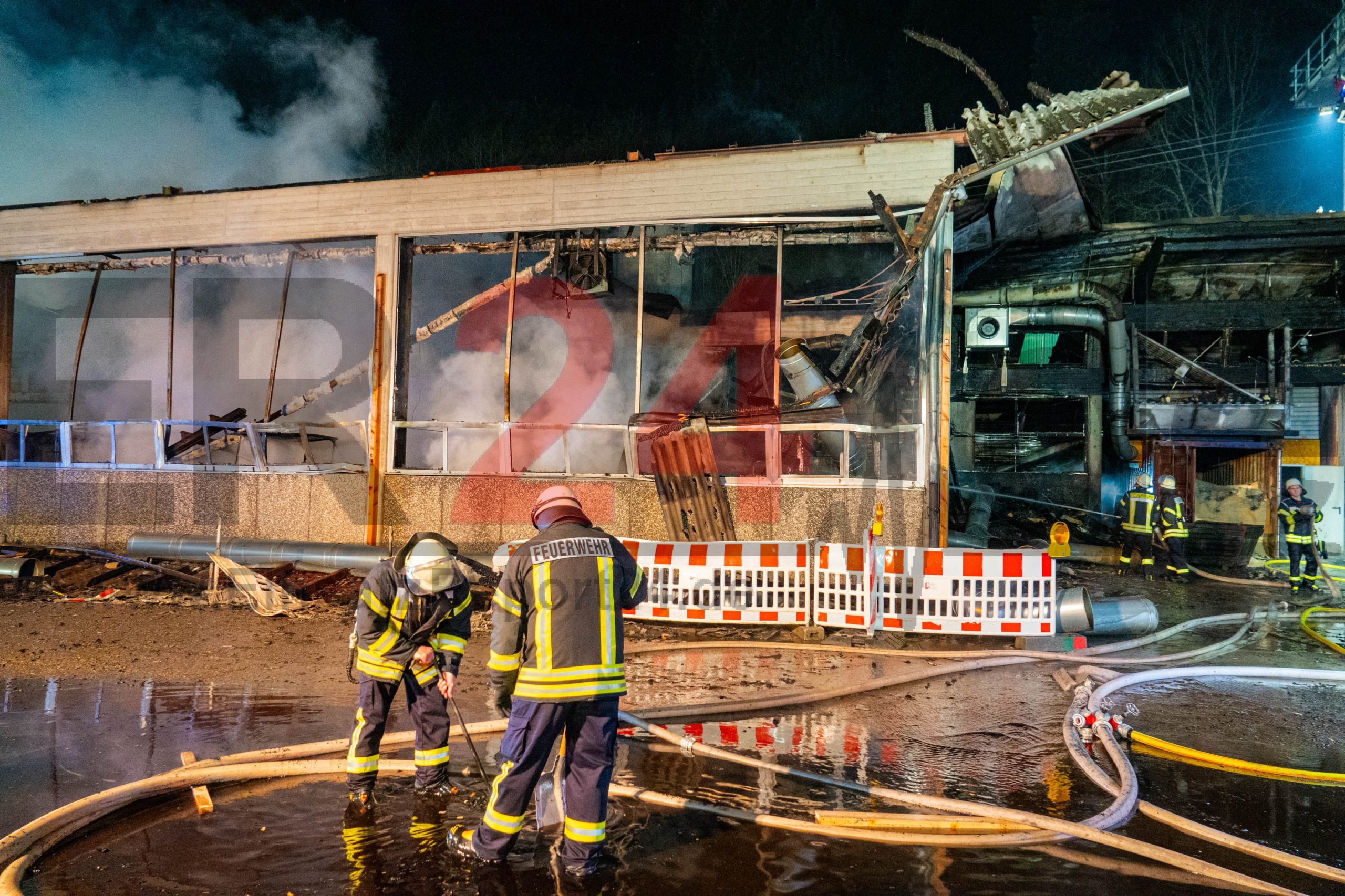 Die Löscharbeiten gestalteten sich äußerst aufwendig und zogen sich bis tief in die Nacht hinein. Viele Einsatzkräfte arbeiteten unter Atemschutz, um gegen die enorme Rauchentwicklung vorzugehen.