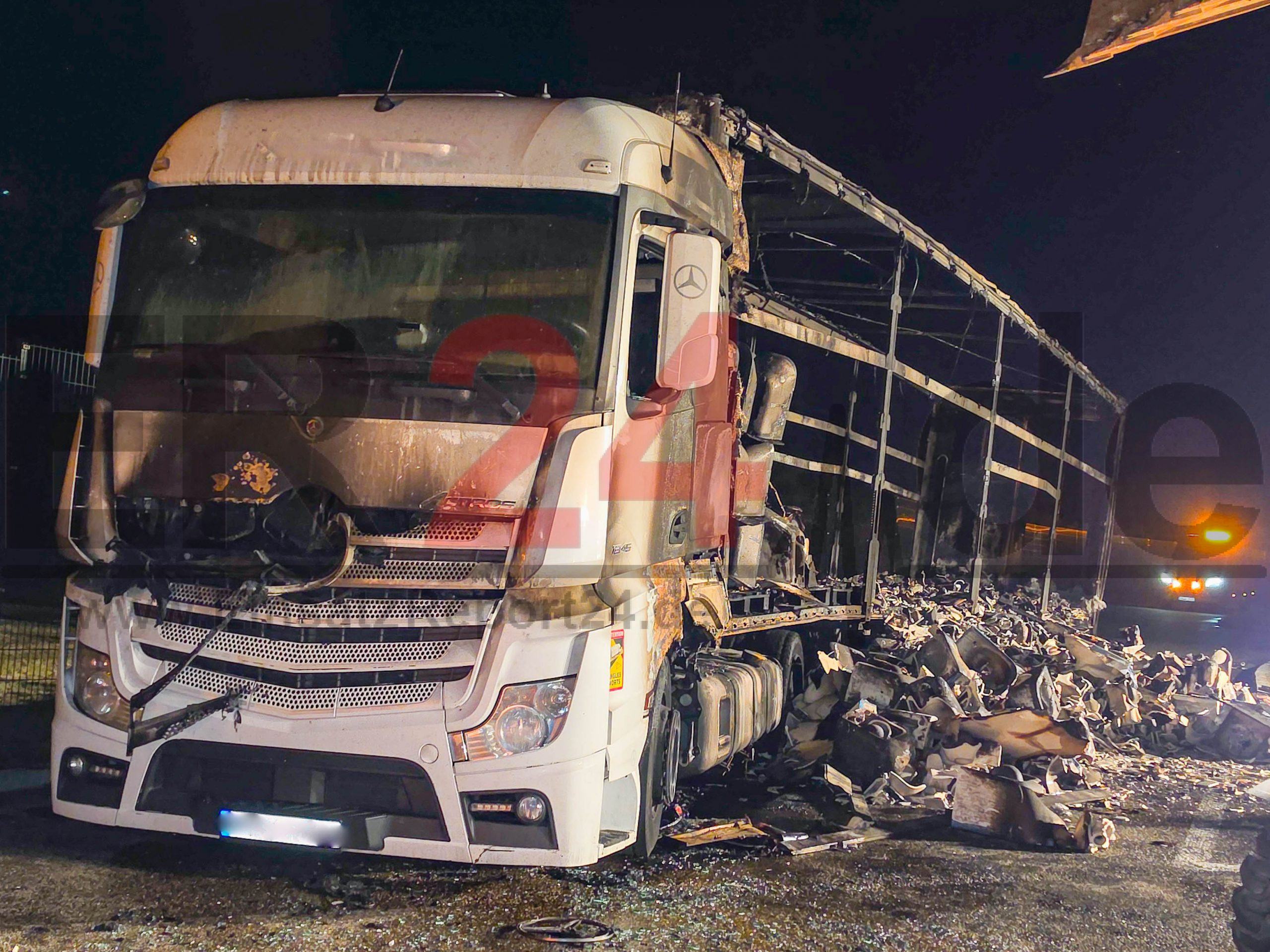 Parkender Sattelzug mit 13 Tonnen geladenen Toilettenschüsseln geht auf Autobahnparkplatz plötzlich in Flammen auf – Lasterfahrer reagiert geistesgegenwärtig und fährt seinen brennenden Lastwagen an das Ende des Parkplatzes um umstehende parkende Lastwagen zu schützen – stundenlange Löscharbeiten der Feuerwehr – aufwändige Bergung der ausgebrannten Kloschüsseln dauert die ganze Nacht an