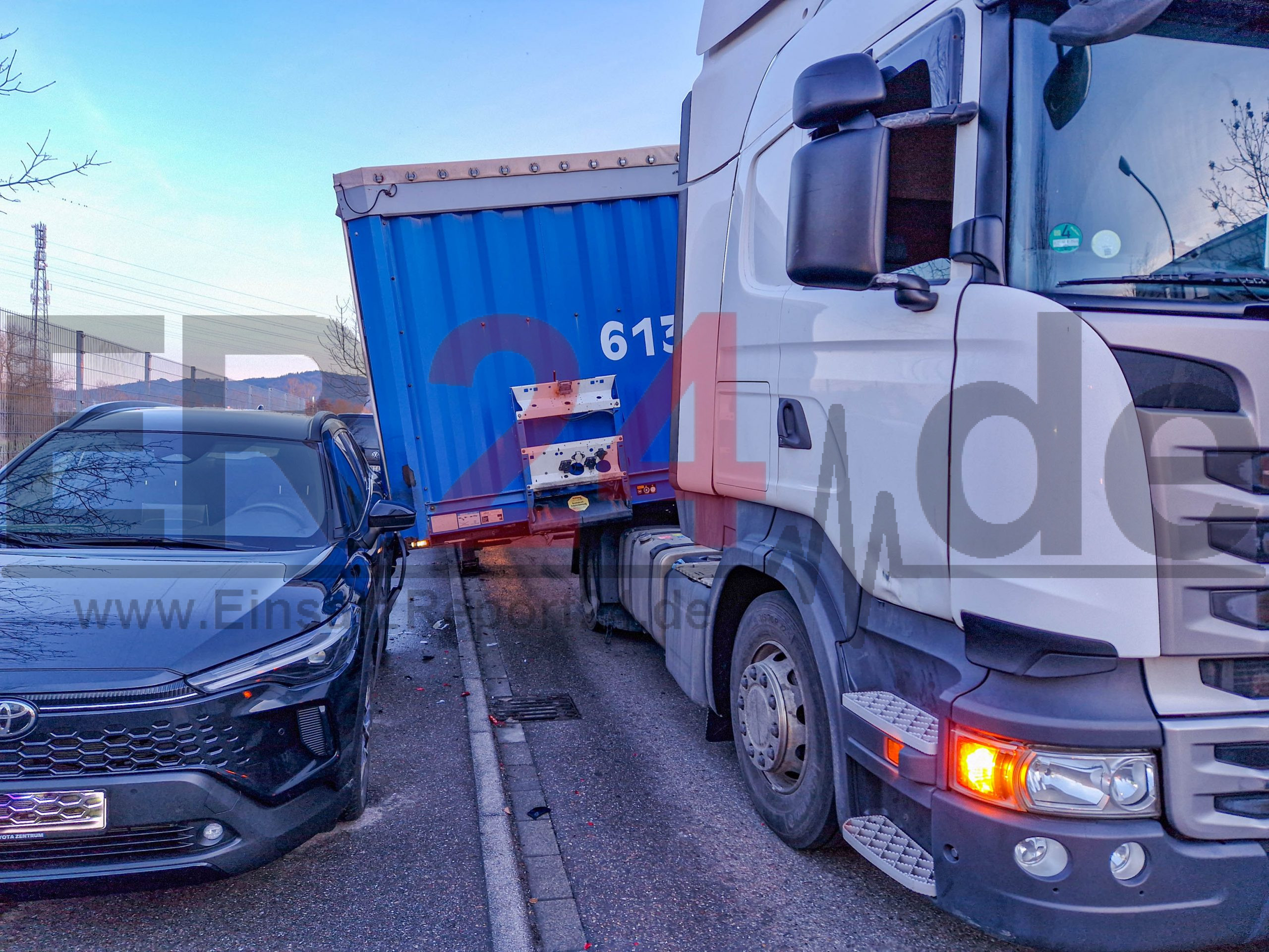 Auflieger von Lastwagen löst sich beim Ausfahren von Betriebshof im Offenburger Industriegebiet – Auflieger rutscht vom Lastwagen und kracht in zwei parkende Fahrzeuge – Bergungsfirma muss mit Kran anrücken