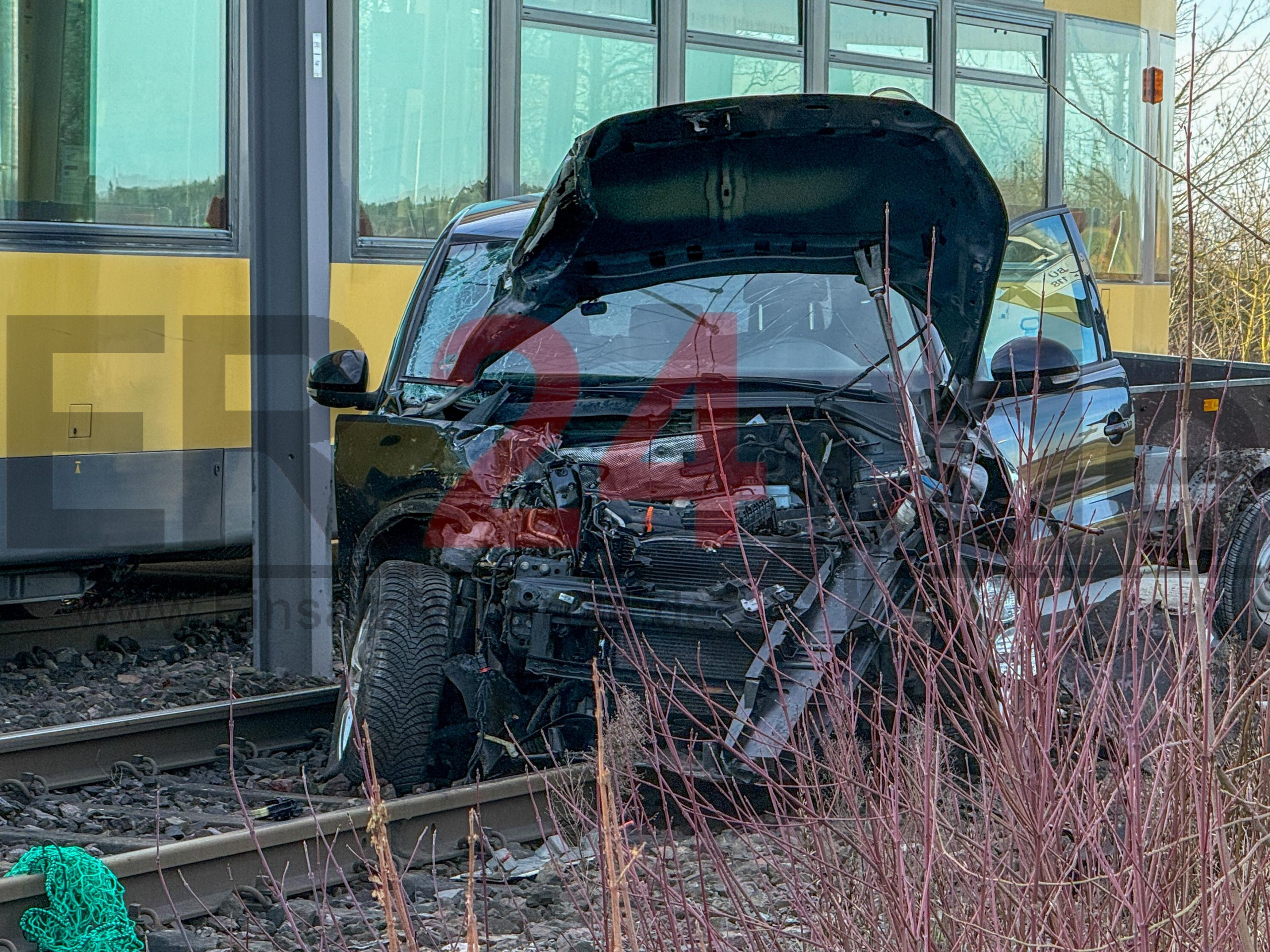 Viele Schutzengel im Einsatz – VW mit Anhänger stößt an unbeschranktem Bahnübergang mit Straßenbahn zusammen – Pkw wird noch einige Meter mitgeschleift und bleibt total beschädigt auf den Gleisen stehen – Glücklicherweise nur zwei Leichtverletzte – Bahnverkehr komplett eingestellt