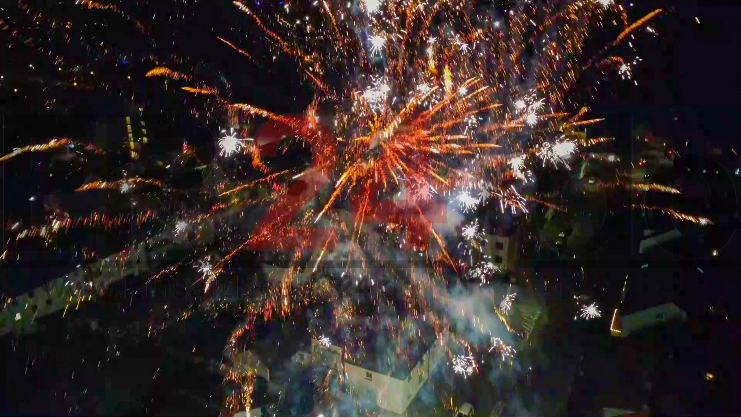 Drohnenaufnahmen zeigen explosives Feuerwerkspektakel aus der Luft – Feuerwerk explodiert eindrucksvoll neben der Drohnenkamera – Pyro-Fackel-Show zum Jahreswechsel