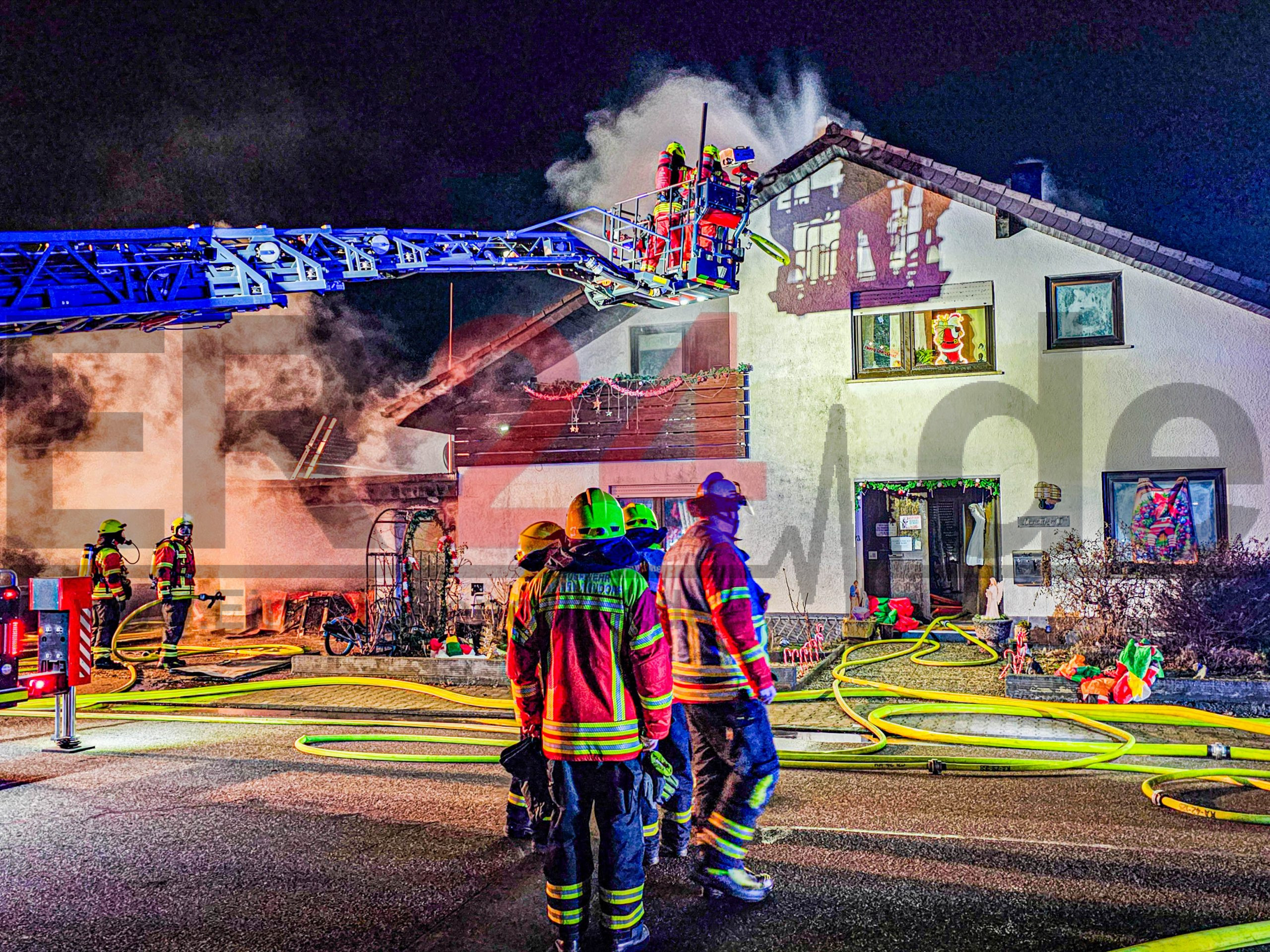 Garagenbrand greift auf Dachstuhl von Einfamilienhaus über – starke Rauchentwicklung weithin sichtbar – über 100 Einsatzkräfte in der Neujahrsnacht im stundenlangen Großeinsatz – Wohnhaus durch Brand nicht mehr bewohnbar