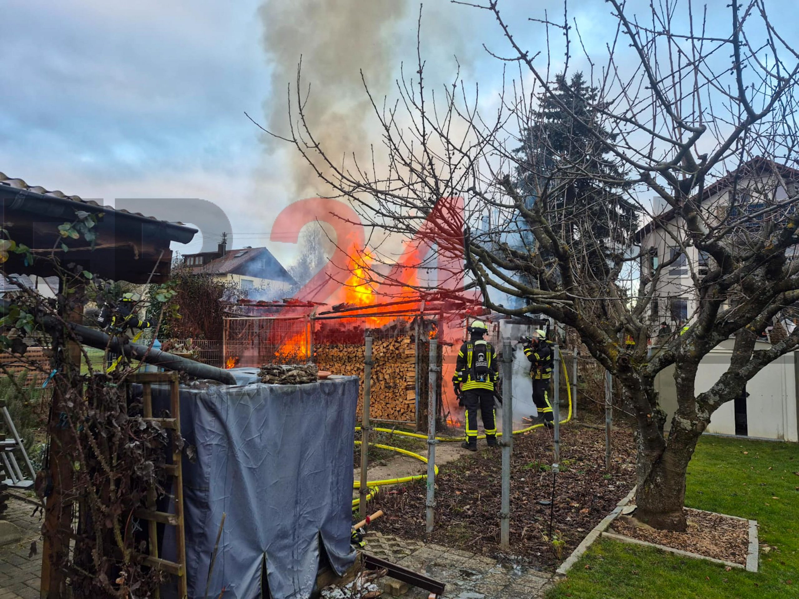 Gartenhütte mit gelagertem Holz steht hinter Wohnhaus lichterloh in Flammen – Feuerwehr kann Brand rasch unter Kontrolle bringen