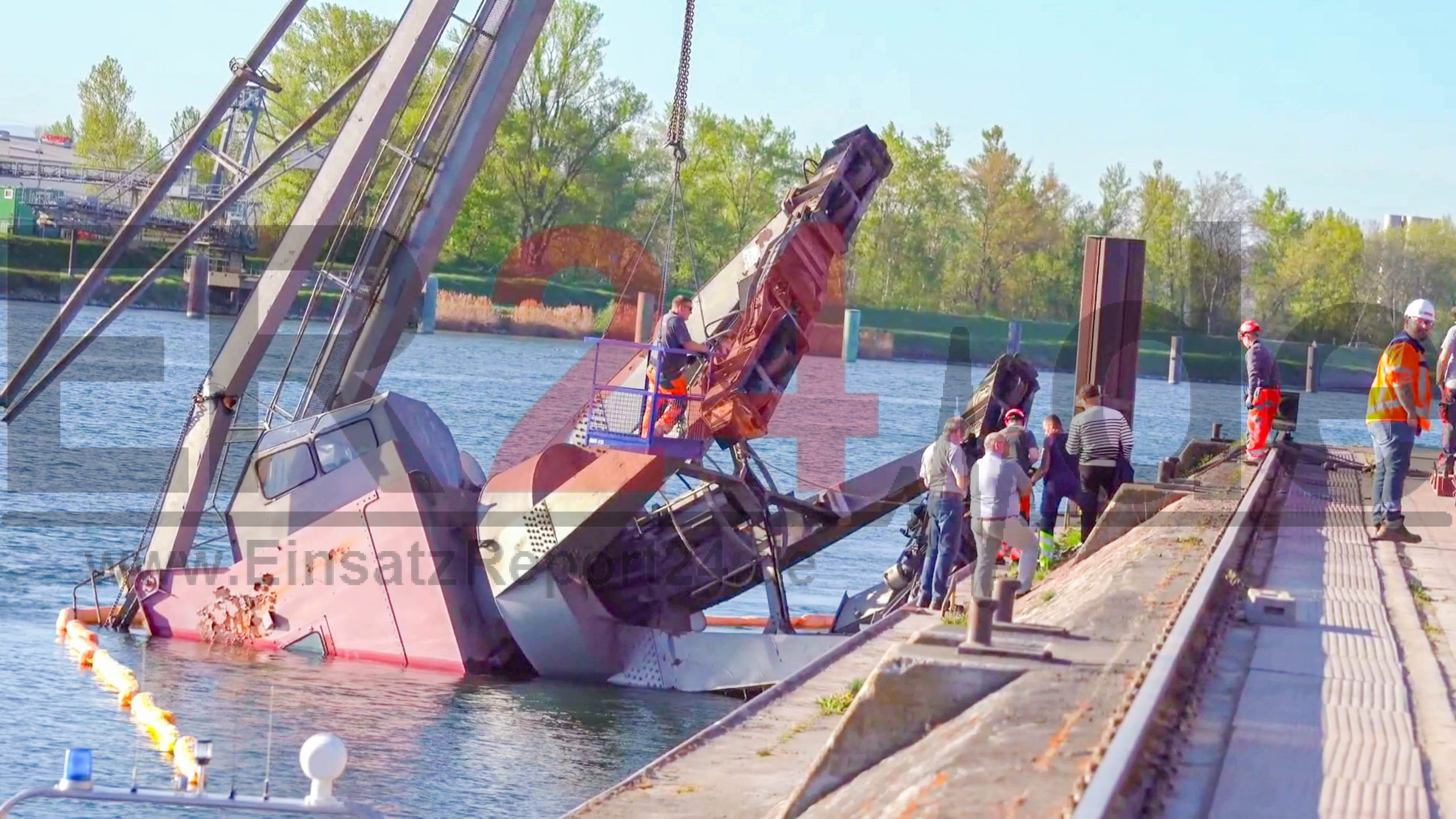 Verladekran kippt am Rheinhafen um, reißt Hubsteiger mit sich und stürzt in den Rhein – zwei Männer im Arbeitskorb des Hubsteigers stürzen ebenfalls in den Rhein und werden unter Wasser gezogen – Ersthelfer retten die Männer aus dem Wasser, beide werden wie durch ein Wunder nur leicht verletzt – tonnenschwerer Autokran geriet bei Bergungsversuchen am Nachmittag ebenfalls in Schräglage