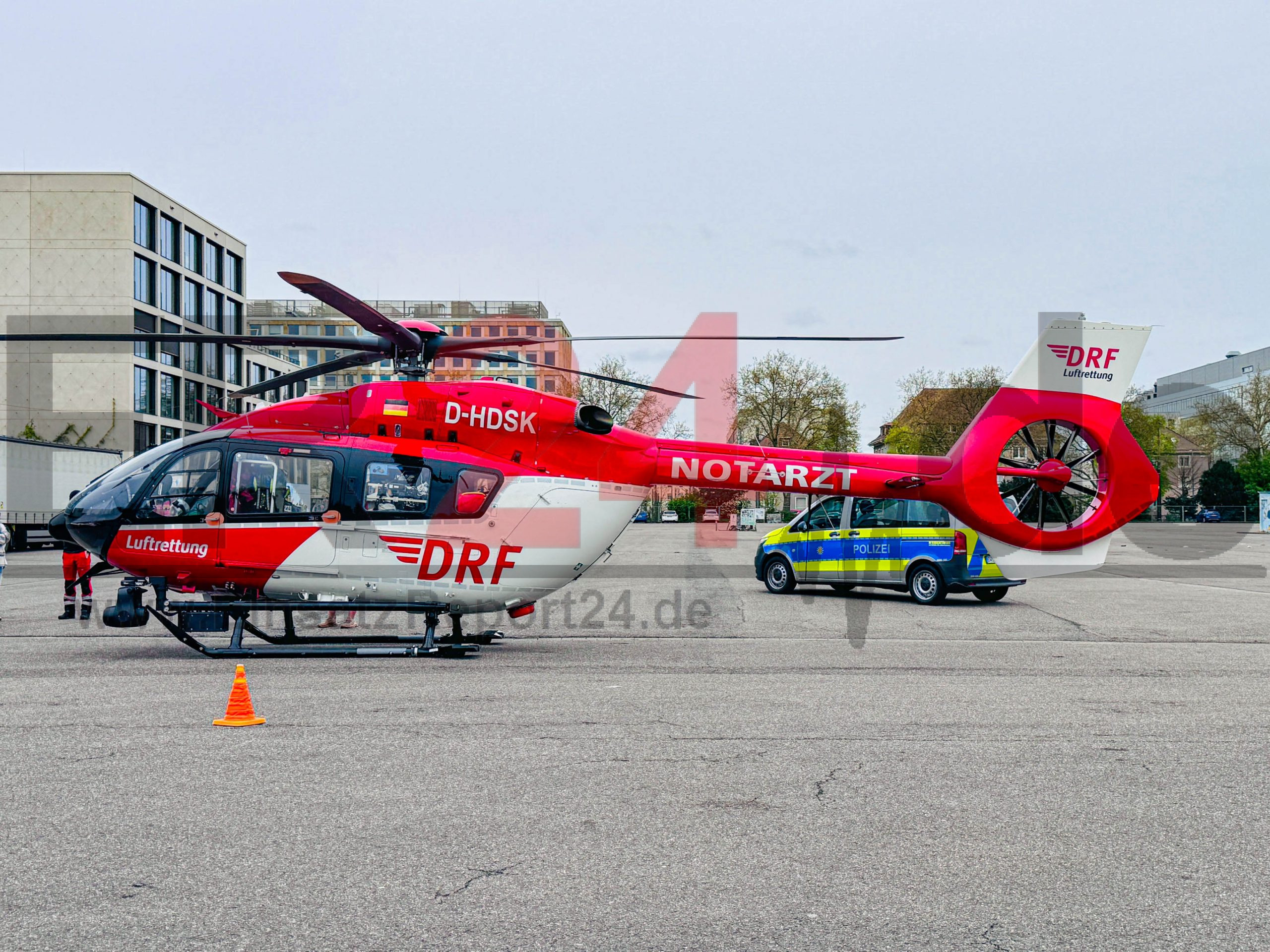 Rettungshubschrauber landet auf dem Messplatz in der Karlsruher Oststadt – Arbeitsunfall am alten Schlachthof fordert eine verletzte Person – Polizei sichert die Landung des Hubschraubers Christoph 43 ab – zahlreiche Neugierige versammelten sich rasch auf dem Messplatz