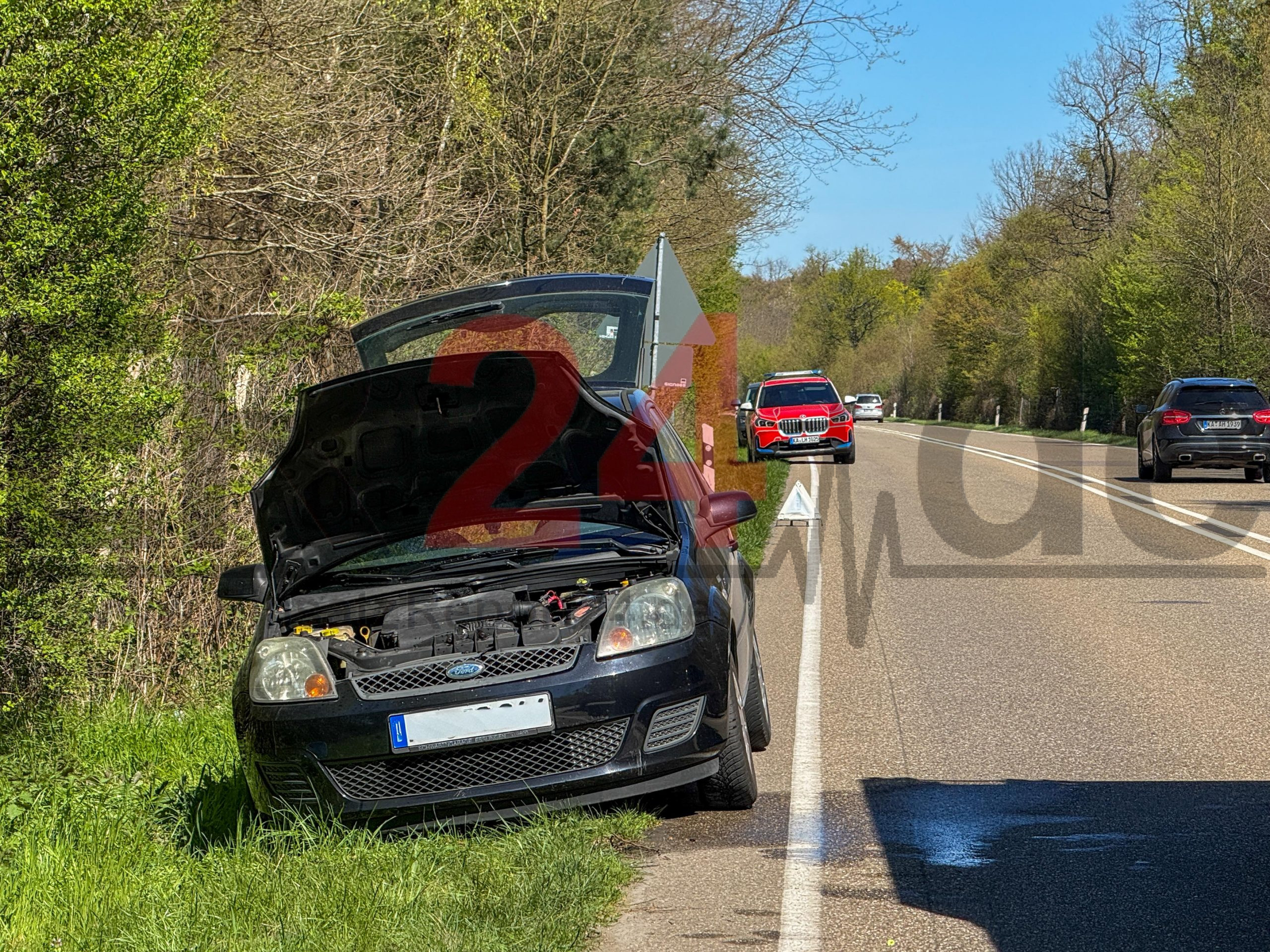 Motorraum von Auto steht plötzlich in Flammen – B36 in Richtung Karlsruhe muss gesperrt werden – Feuerwehr kann Brand rasch unter Kontrolle bringen