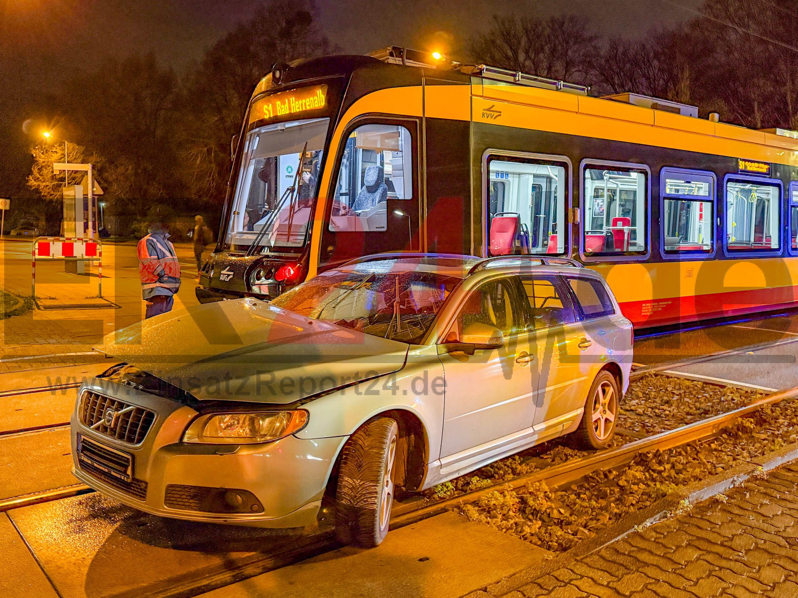 Volvo kollidiert an unbeschranktem Bahnübergang mit Straßenbahn – Autofahrer wird bei Zusammenstoß verletzt – Bahnverkehr am Abend unterbrochen