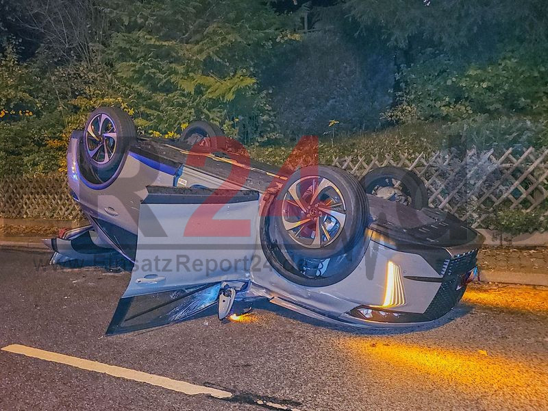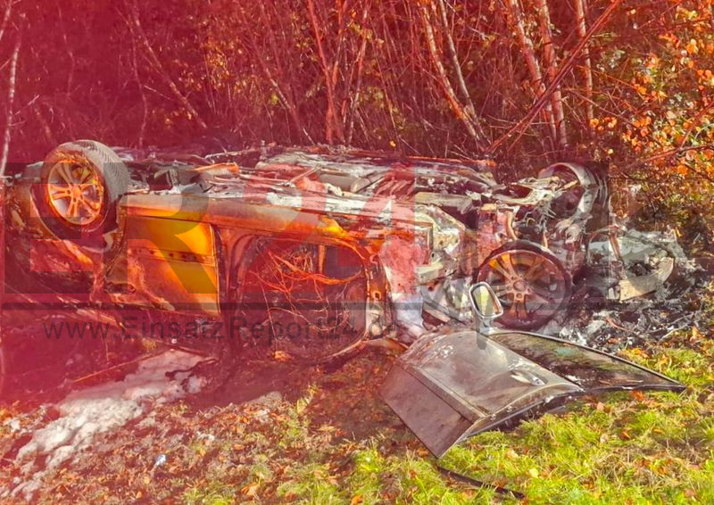Fahrzeug kommt von Landstraße ab, überschlägt sich und landet auf dem Dach am Waldrand – Auto geht sofort in Flammen auf, die Insassen können sich glücklicherweise selbst aus dem Unfallwrack retten