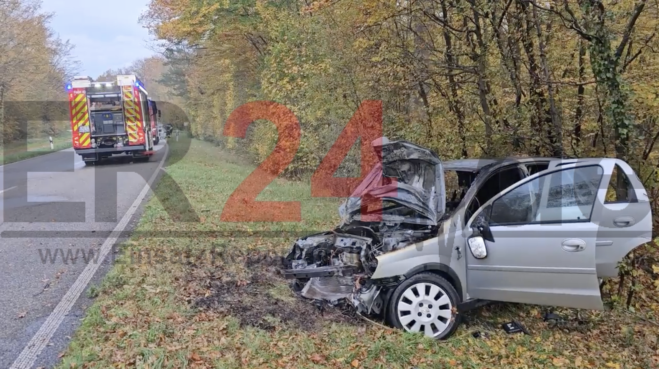 Opel-Fahrer kommt von Landstraße ab und prallt frontal gegen Baum – Auto geht sofort in Flammen auf – Ersthelfer befreien Mann aus Unfallwrack – Feuerwehr kann den Brand rasch löschen – der Fahrer wird verletzt, die Polizei vermutet eine Alkoholisierung