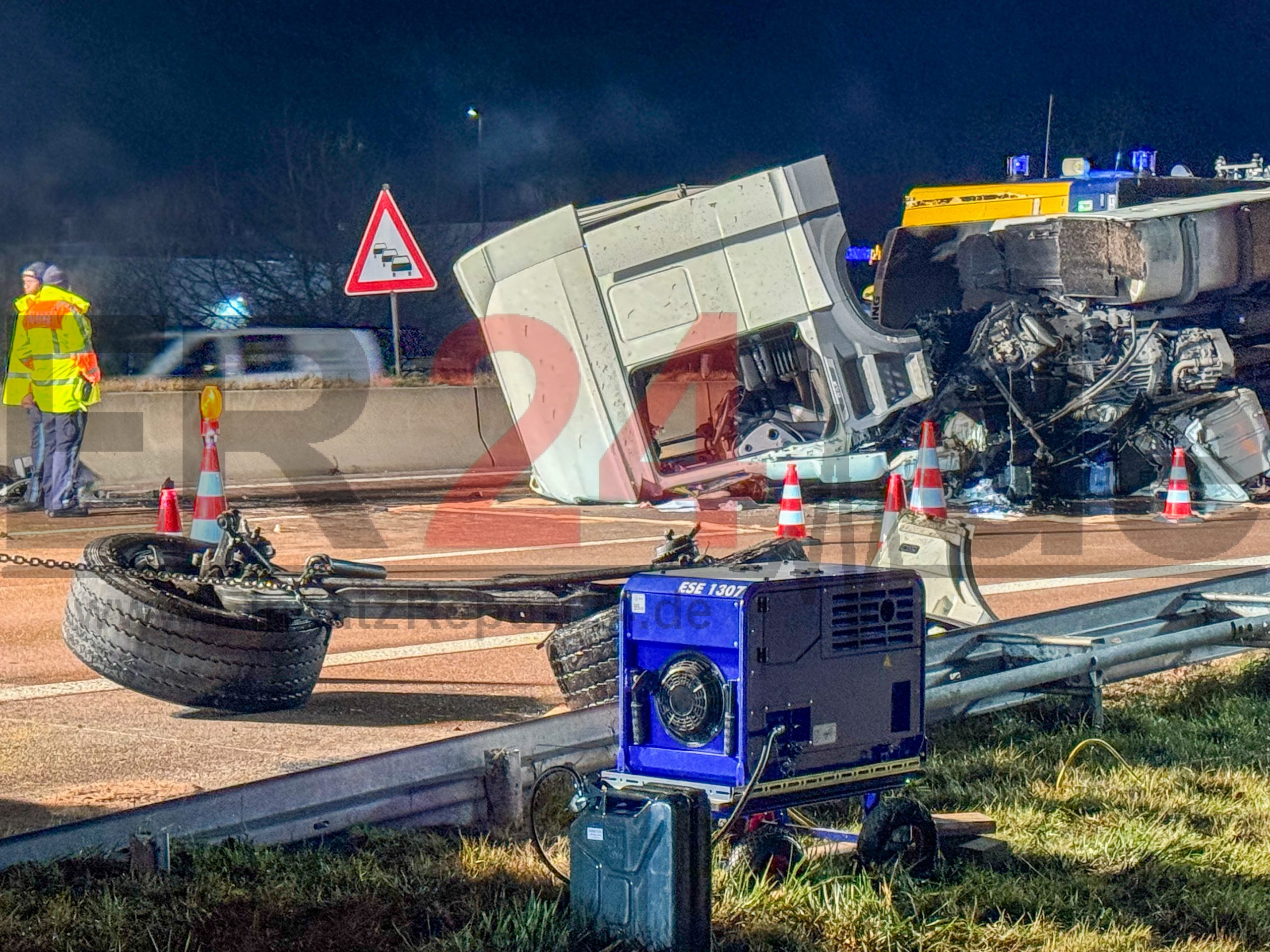 40-Tonner voller Kühlprodukte donnert auf der Autobahn in die Betonleitplanke und kippt um – Fahrerhaus reißt ab und wird nach vorne weggedrückt – Trümmerteile fliegen auf Gegenfahrbahn und treffen mehrere Autos – verletzter Lasterfahrer muss von der Feuerwehr befreit werden – tonnenweise Käse und Milch muss händisch von den Rettungskräften entladen werden