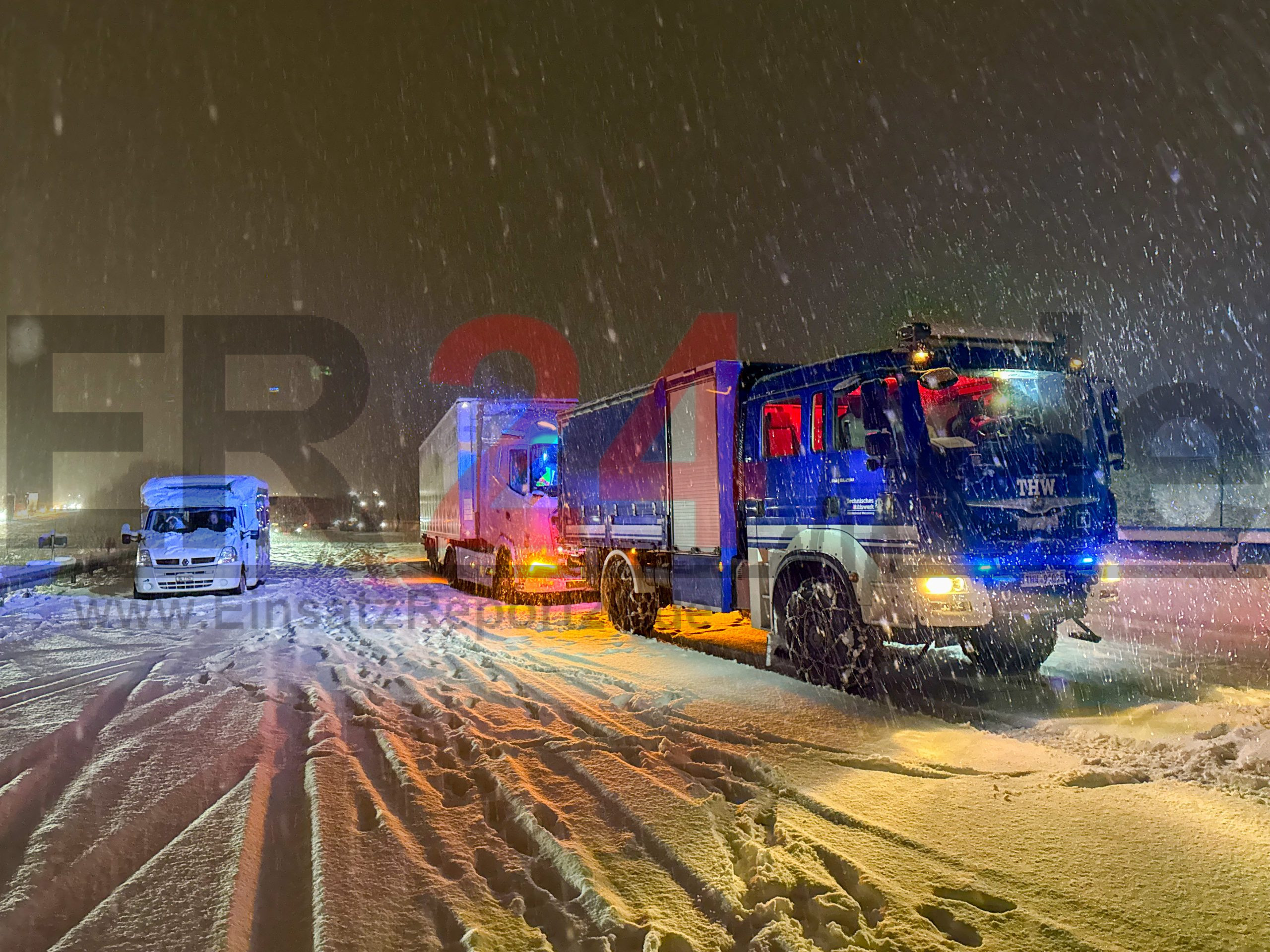 Zahlreiche Lastwagen bleiben auf der Autobahn im Schnee stecken – THW und Bergungsdienste im Dauereinsatz, um Lkw von der Fahrbahn zu ziehen