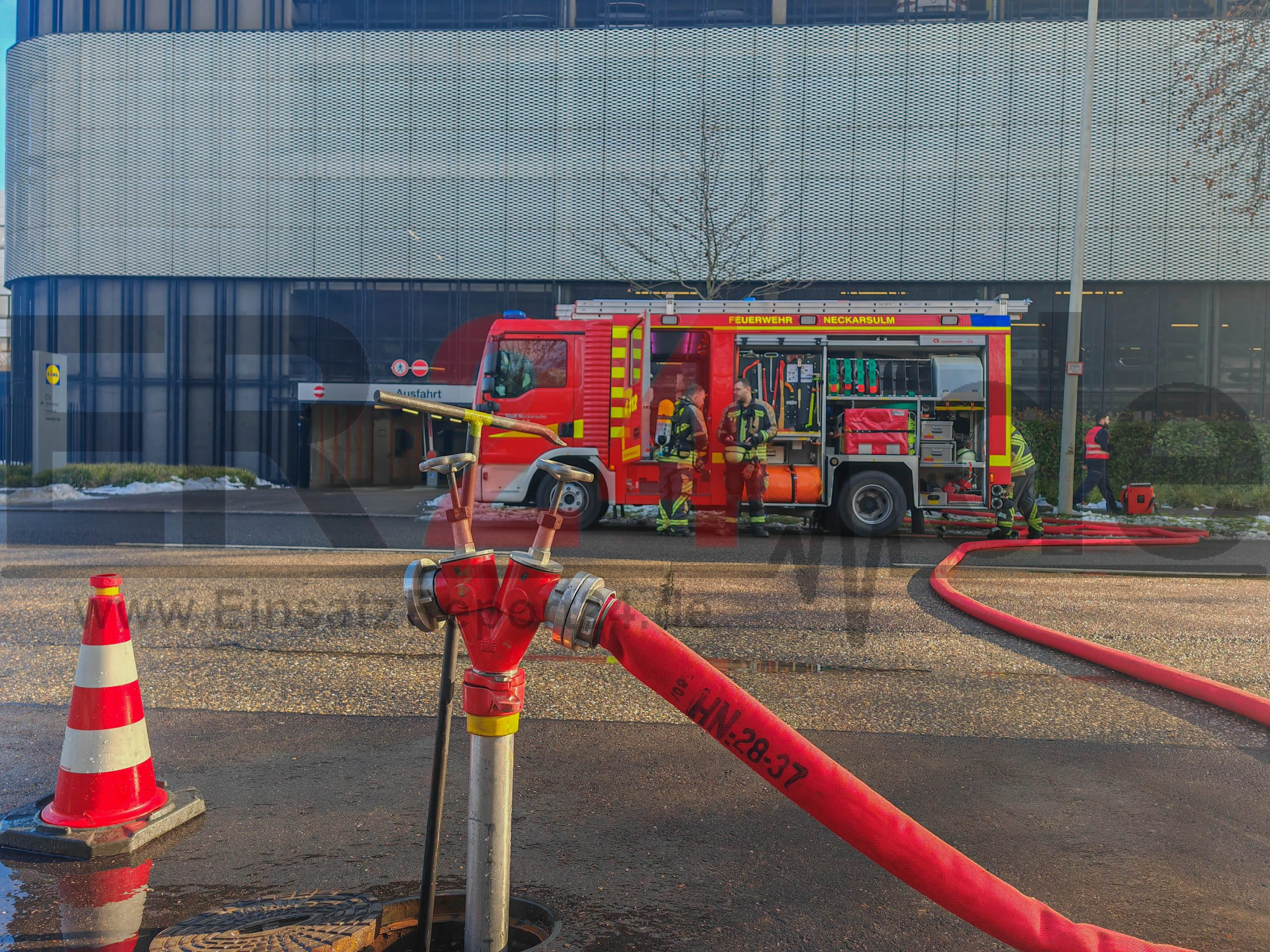 Verbrenner-Auto in Brand geraten – Feuer greift auf anderes Fahrzeug über und beschädigt weitere Autos im Parkhaus von Lidl-Verwaltungsgebäude – Straßensperrung für Löscharbeiten und Wasserversorgung