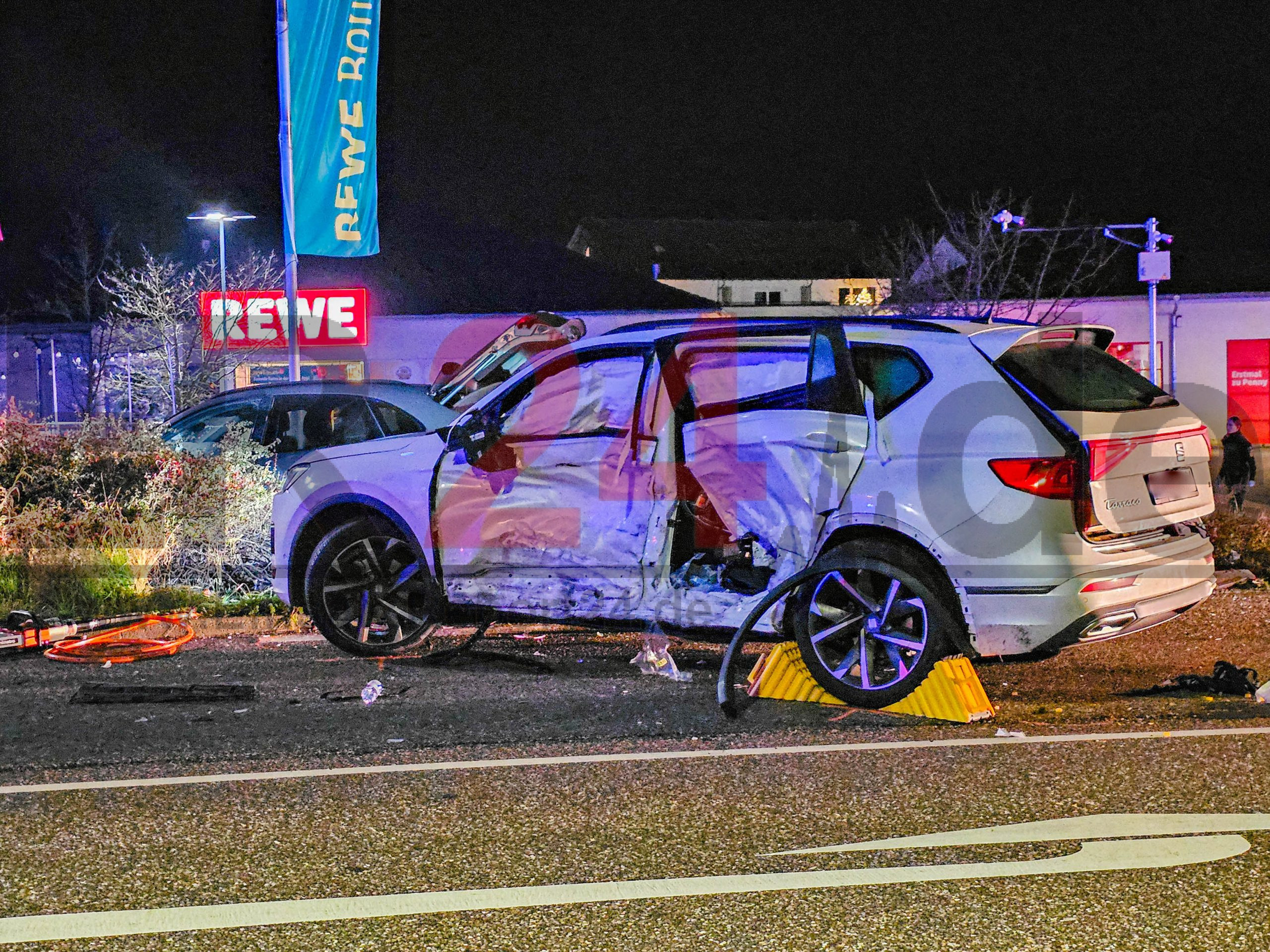 Porsche und Seat kollidieren an Ausfahrt von Supermarkt – Porsche wird in Gebüsch geschleudert, großes Trümmerfeld auf der Bundesstraße – sechs Personen werden verletzt