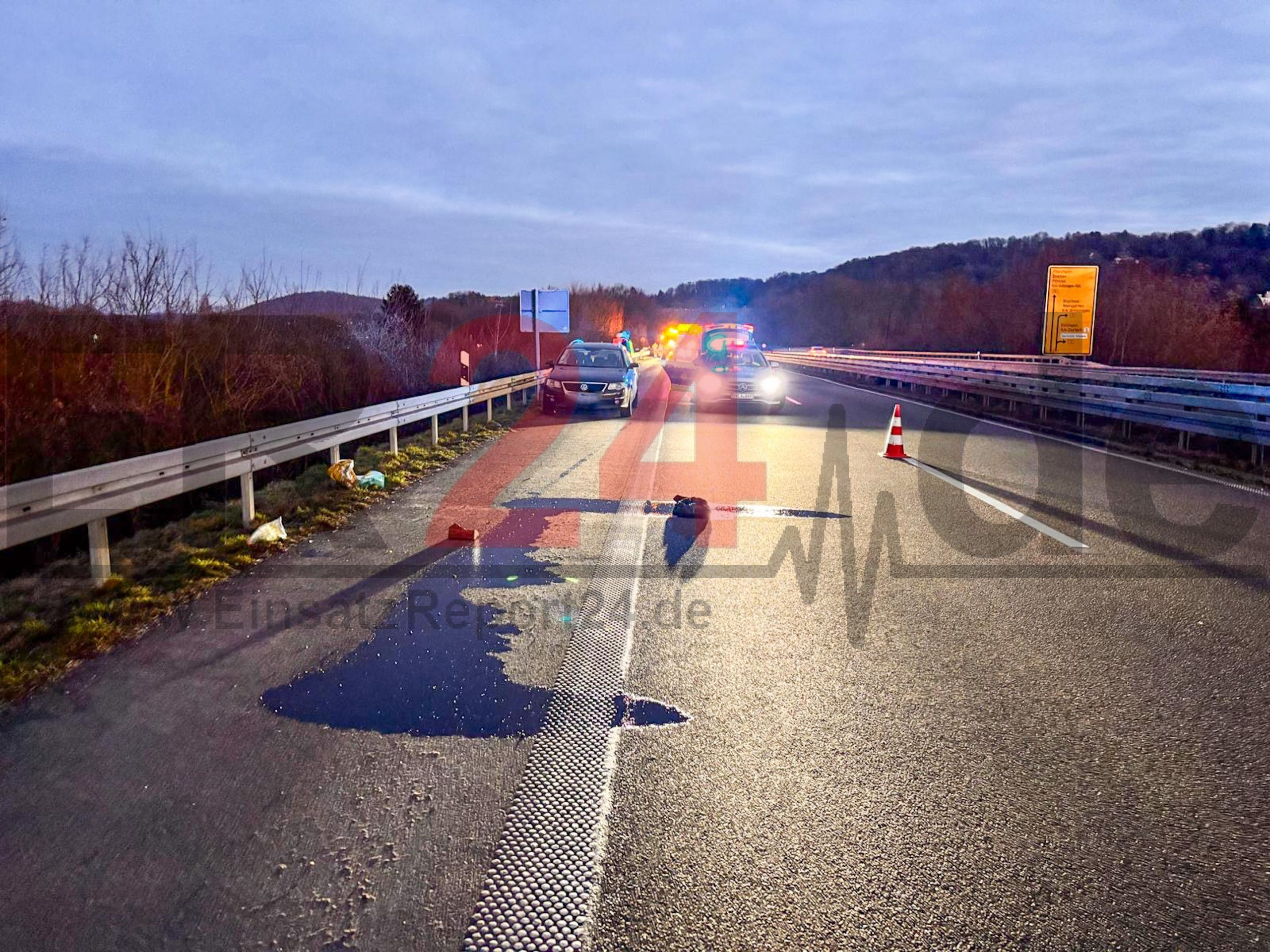 Lastwagen verliert Keil auf der Bundesstraße – Autofahrer fährt mit VW über Gegenstand und reißt sich Ölwanne auf – Betriebsstoffe laufen auf Bundesstraße